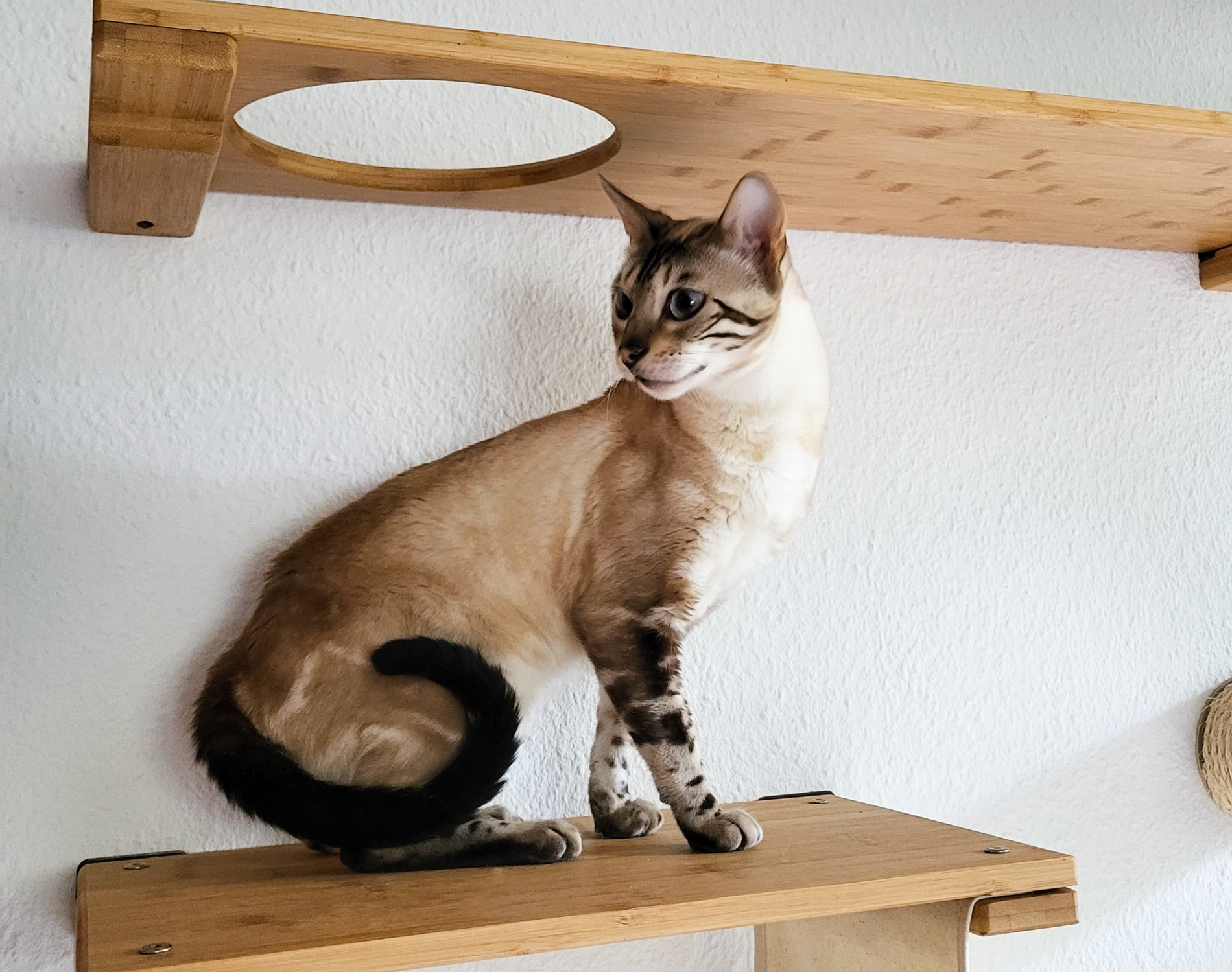 Sie lebt aktuell mit gesichertem Balkon, Kratzbaum und Kletterwand. Intelligenzspielzeug löst sie blitzschnell – Unterforderung frustriert sie, deshalb sollte ihr neues Zuhause ähnliche oder bessere Möglichkeiten bieten. Nach einer Eingewöhnungszeit und Vertrauen geht sie gern bei trockenem Wetter spazieren, zunächst an der Leine, später/nach Umgebung reicht ihr Geschirr. Ungesicherter Freigang ohne Begleitung kommt nicht infrage.
