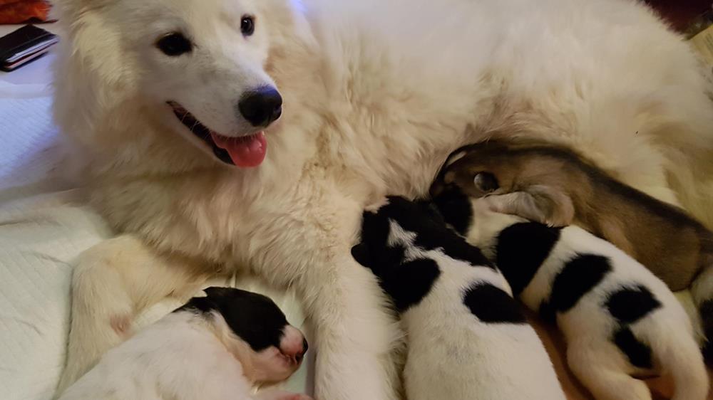 Ich bin Tali, eine reinrassige Samojedin. Am 5.12.2018 habe ich 5 Nikolausbabys zur Welt gebracht. Kono (Noshimuri)/w, Coco (Chanel)/w, Kensi (Blye)/w, Mozzi/w und Bounty/m.