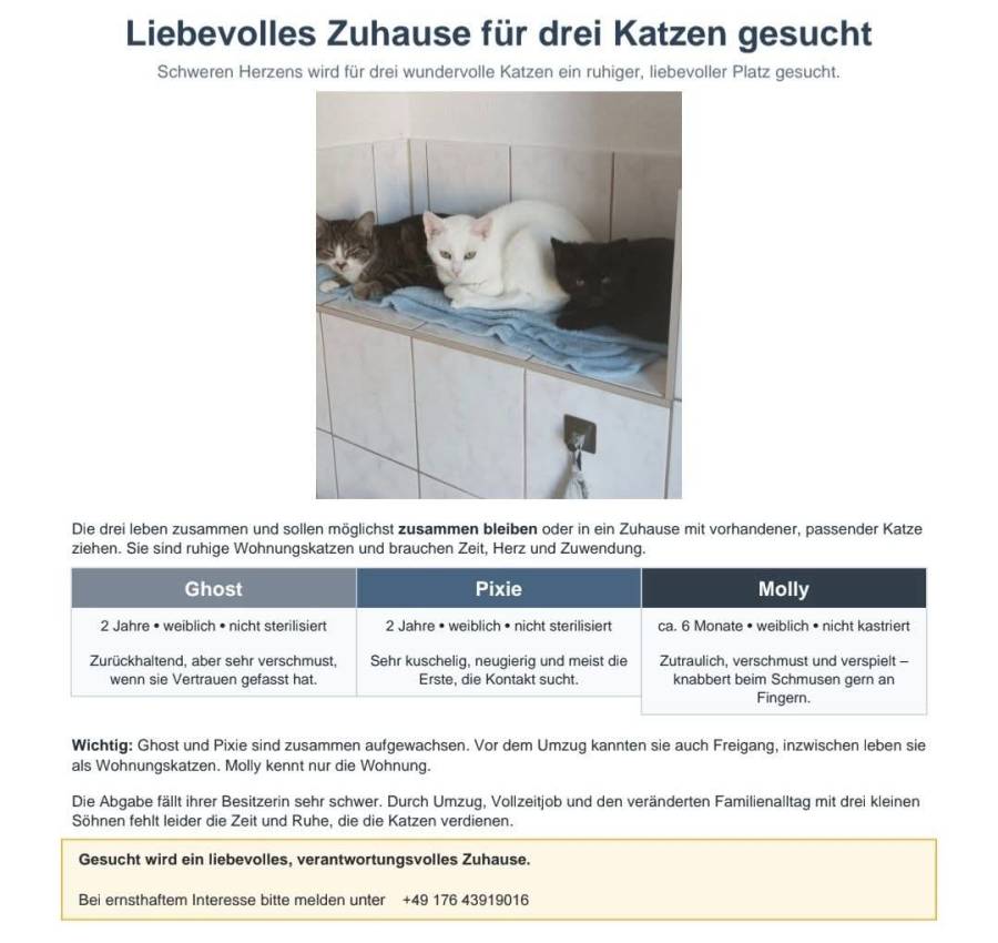 Schweren Herzens suche ich für meine drei Katzen ein neues Zuhause.